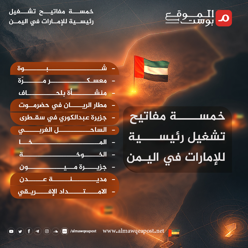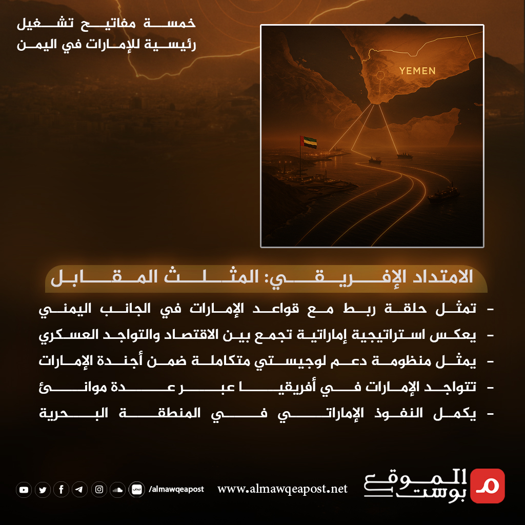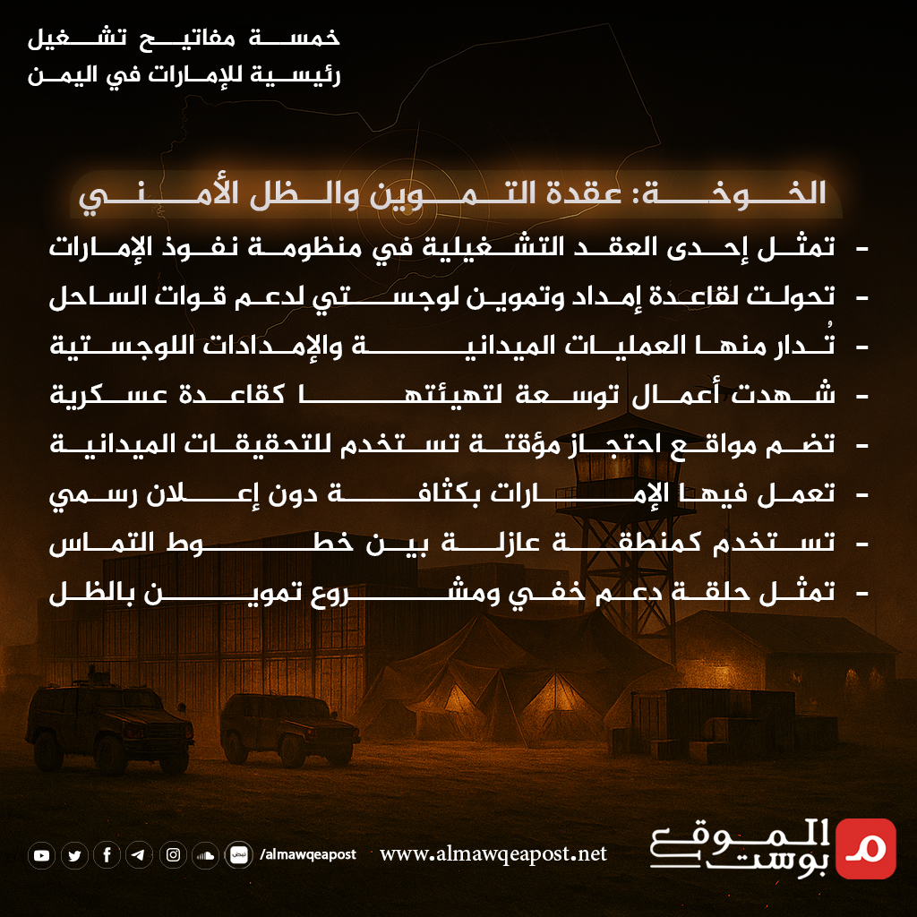 عند جمع خيوط الصورة من شبوة إلى بربرة، يتضح أن المشروع الإماراتي لم يعد مجرد تدخل عسكري في حرب اليمن، بل تحول إلى بنية نفوذ هندسية–جيوسياسية تعمل وفق منطق البحر لا البر. هذه البنية تعتمد على خمسة مفاتيح تشغيل رئيسية: المنبع في شبوة (معسكر مرّة)، الشفة في بلحاف، البرج في الريان، السنترال في ميون، والورشة في المخا، مع رأس شبكة إداري في عدن، وامتداد مقابل في القرن الإفريقي.