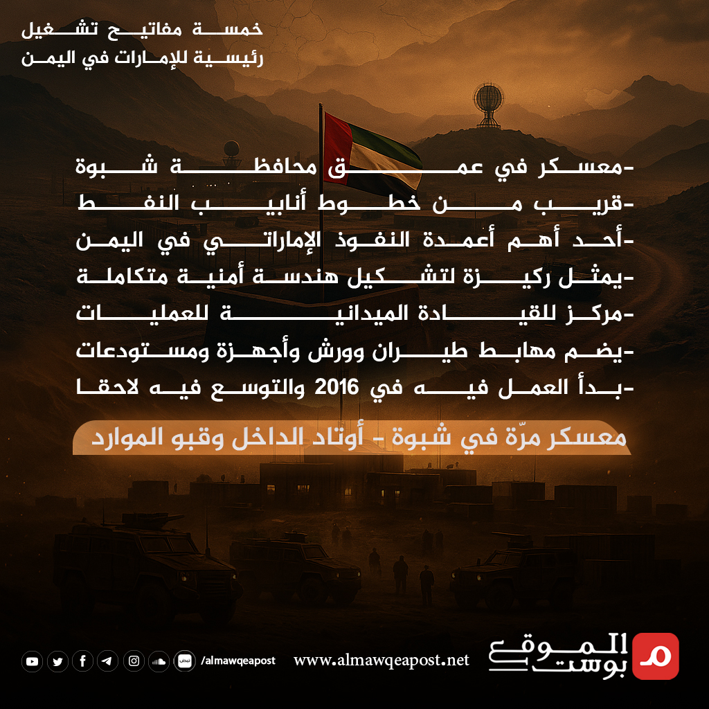 في عمق محافظة شبوة، وعلى مقربة من خطوط أنابيب النفط الممتدة من بيحان ومأرب إلى بلحاف، يقع معسكر مرّة الذي مثل منذ 2016 أحد أهم أعمدة النفوذ الإماراتي في الداخل اليمني.