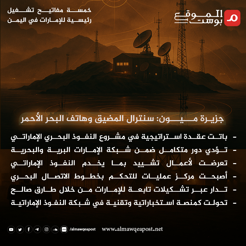 بهذا المعنى، تتحول ميون من سنترال للمضيق إلى عقدة استخباراتية متقدمة، لا تراقب البحر فقط بل تحلله وتعيد توجيه قراءته السياسية والعسكرية. إنها ليست مجرد جزيرة في خريطة النفوذ، بل مركز بيانات للبحر الأحمر، حيث تمتزج الجغرافيا بالسيبرانية، والمضيق بالمعلومة.