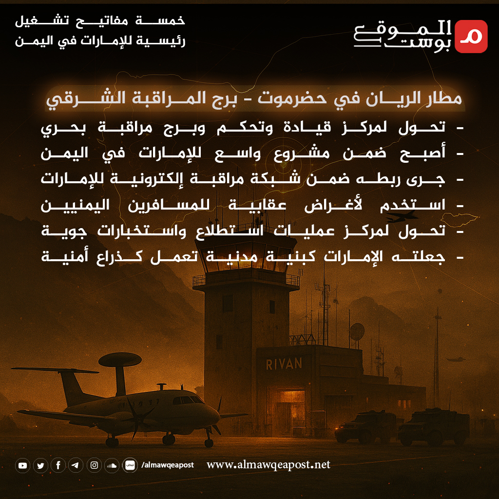هذا الدور المزدوج جعل من الريان نموذجا مصغرا لمعادلة السيطرة الإماراتية في اليمن: بنية مدنية تعمل كذراع أمنية، وبنية أمنية تقدم كحماية تنموية. فالمطار الذي كان يوماً منفذاً للتجارة والسفر، أصبح الآن مركزاً لتنسيق المراقبة والتحكم في البحر واليابسة على حد سواء، مما جعله البرج الشرقي لشبكة النفوذ الممتدة عبر سواحل اليمن.