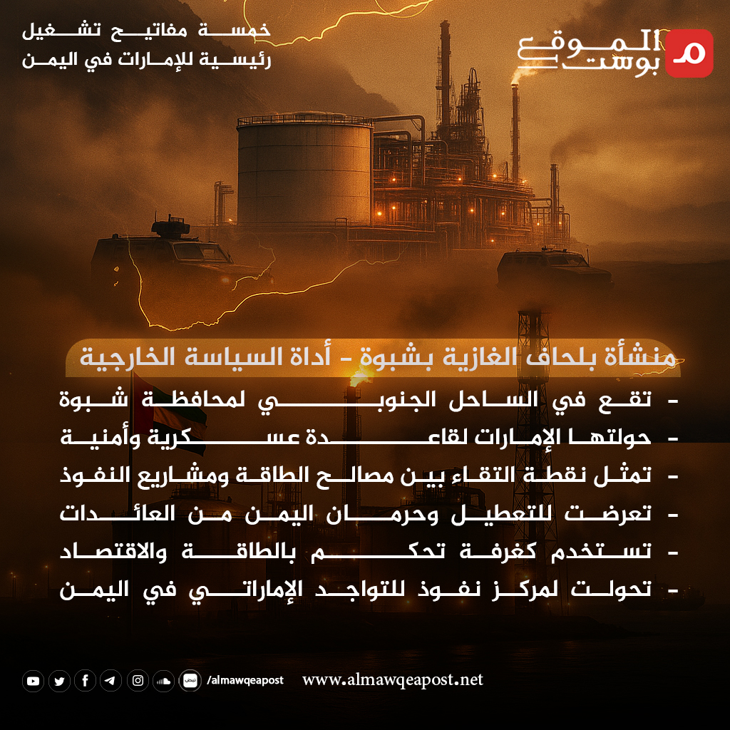 منشأة بلحاف الواقعة على الساحل الجنوبي لمحافظة شبوة لم تعد مجرد مشروع اقتصادي لتسييل الغاز الطبيعي، بل تحولت إلى محور صراع السيادة والنفوذ في اليمن، فمنذ بداية الحرب، اتخذت الإمارات من الموقع قاعدة استراتيجية تمزج بين الأبعاد الاقتصادية والعسكرية والأمنية، ما جعلها نقطة التقاء بين مصالح الطاقة ومشاريع النفوذ الإقليمي.