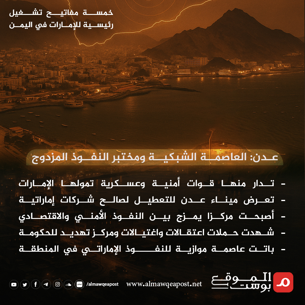 في عدن تتشابك الخيوط السياسية والعسكرية لتشكل عقدة السلطة والنفوذ الأكثر تعقيداً في المشهد اليمني. فمنذ أن فرض المجلس الانتقالي الجنوبي سيطرته على المدينة عام 2019 بدعم إماراتي مباشر، عملت أبوظبي على تثبيت هذا الكيان كذراع سياسي وأمني لها من خلال عمليات ممنهجة لتصفية خصومه داخل المدينة، ومنع عودة الرئيس عبدربه منصور هادي إلى العاصمة المؤقتة، وتعطيل انعقاد البرلمان في عدن عبر أدوات ضغط ميدانية وهجمات على قصر معاشيق في أكثر من مناسبة. كما أشرفت الإمارات على بناء قوات أمنية وعسكرية خارج سلطة الحكومة، وأقامت شبكة من السجون السرية في البريقة وعدن الصغرى يديرها ضباط إماراتيون ومحليون موالون لها، رافقها حملات اعتقال لناشطين وضباط رافضين للنفوذ الجديد. بالتوازي، جرى تعطيل نشاط ميناء عدن تدريجياً لصالح تحويل حركة الشحن نحو الموانئ التي تديرها شركات إماراتية، فيما تم إنشاء قاعدة عسكرية موسعة في العند تُدار من قبل قوات إماراتية تشرف على المجال الجوي والبري للمدينة. هذه التحركات مجتمعة مكنت أبوظبي من فرض هيمنة شاملة على عدن إعلامياً وأمنياً واقتصادياً، لتتحول إلى عاصمة موازية تعمل وفق نموذج "الإدارة الشبكية" الذي تمزج فيه بين النفوذ الأمني والاقتصادي والإداري.