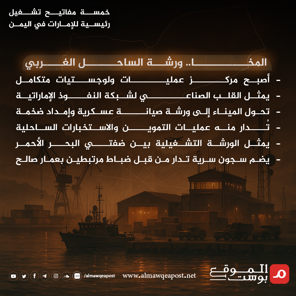 لم تعد المخا مجرد ميناء البن التاريخي، بل تحولت خلال الحرب إلى مركز عمليات ولوجستيات متكامل، يمثل القلب الصناعي لشبكة النفوذ الإماراتية على الساحل الغربي. فمنذ عام 2017، بدأ تحويل الميناء إلى ورشة صيانة وإمداد ضخمة، تعمل على دعم القوات المنتشرة في الشريط الساحلي الممتد من الخوخة إلى باب المندب.