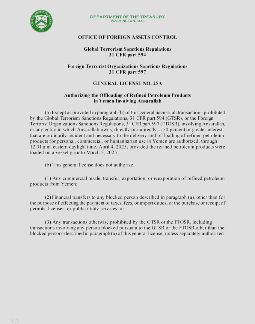 وبحسب وثيقة صادرة عن مكتب مراقبة الأصول الأجنبية في الخزانة الأمريكية، فقد سُمح بتفريغ المنتجات البترولية التابعة للحوثي أو أي كيان يمتلكون فيه حصة تقدر بـ50% أو أكثر، حتى فجر الرابع من أبريل/ نيسان القادم.