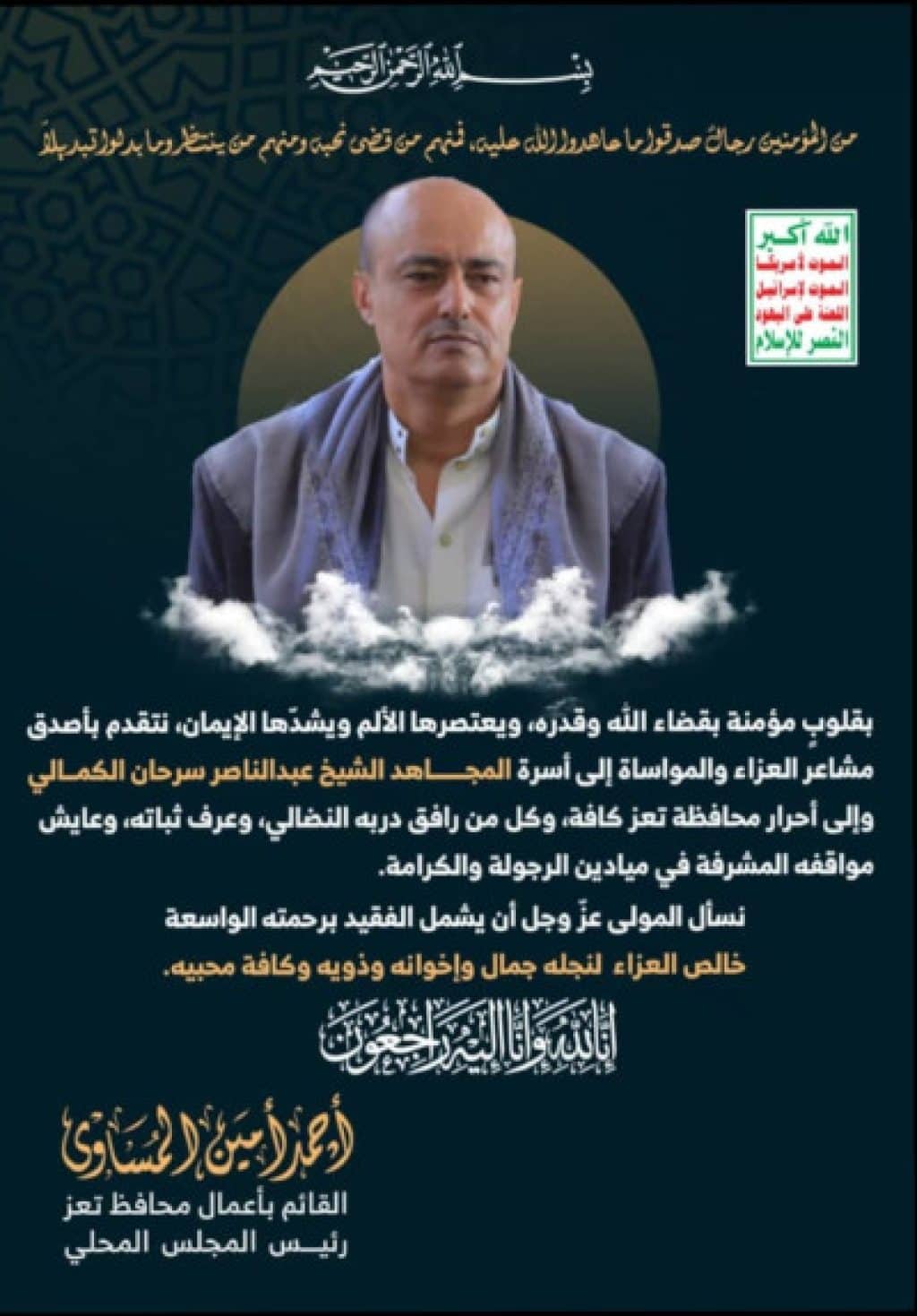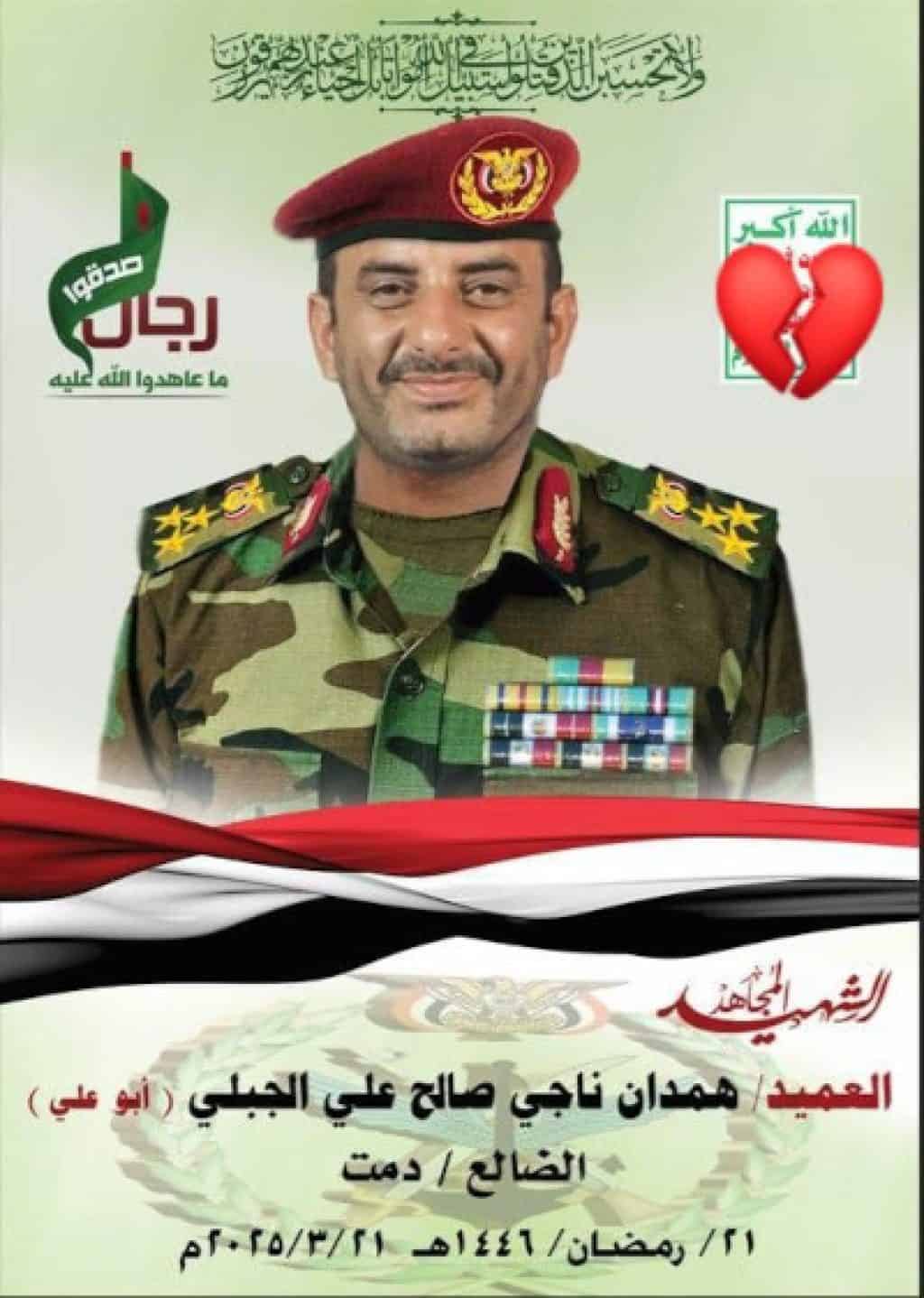 في 23 مارس/آذار، أفادت وكالة الأنباء اليمنية (سبأ) أن رئيس المجلس السياسي الأعلى للحوثيين، مهدي المشاط، بعث برقية تعزية في وفاة العميد الركن همدان ناجي صالح الجبلي، مساعد قائد المنطقة العسكرية الرابعة. وبينما لم توضح البرقية كيفية استشهاد الجبلي، ذكر تقرير منفصل أنه "استشهد أثناء تأدية واجبه دفاعًا عن الوطن".