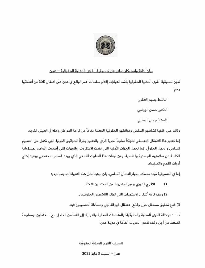 وأدانت تنسيقية القوى المدنية الحقوقية بأشد العبارات إقدام سلطات الأمر الواقع في عدن على اعتقال ثلاثة من أعضائها على خلفية نشاطهم السلمي ومواقفهم الحقوقية.