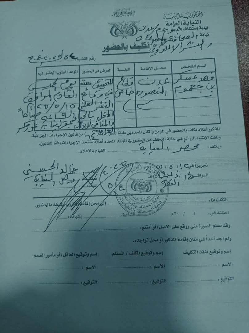 جاء ذلك في مذكرة لنيابة الصحافة والمطبوعات في عدن، في القضية رقم 54 للعام 2025م.
