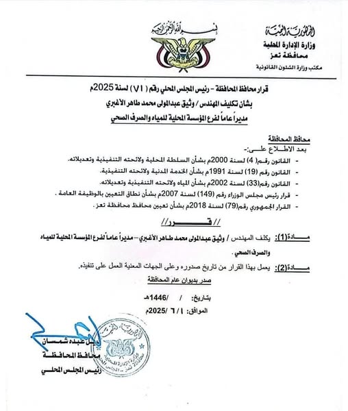 وبحسب قرار المحافظ شمسان، فقد أقال المدير سمير عبدالواحد وعين وثيق عبدالولي محمد طاهر الأغبري، مديرا عاما لفرع المؤسسة المحلية للمياه والصرف الصحي.