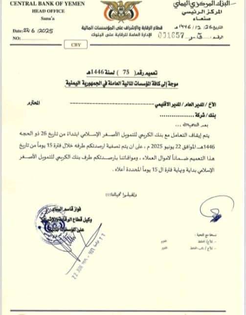 جاء ذلك في تعميم جديد أصدره البنك المركزي بصنعاء، للمؤسسات والشركات المالية والمصرفية بمناطق سيطرة الجماعة.