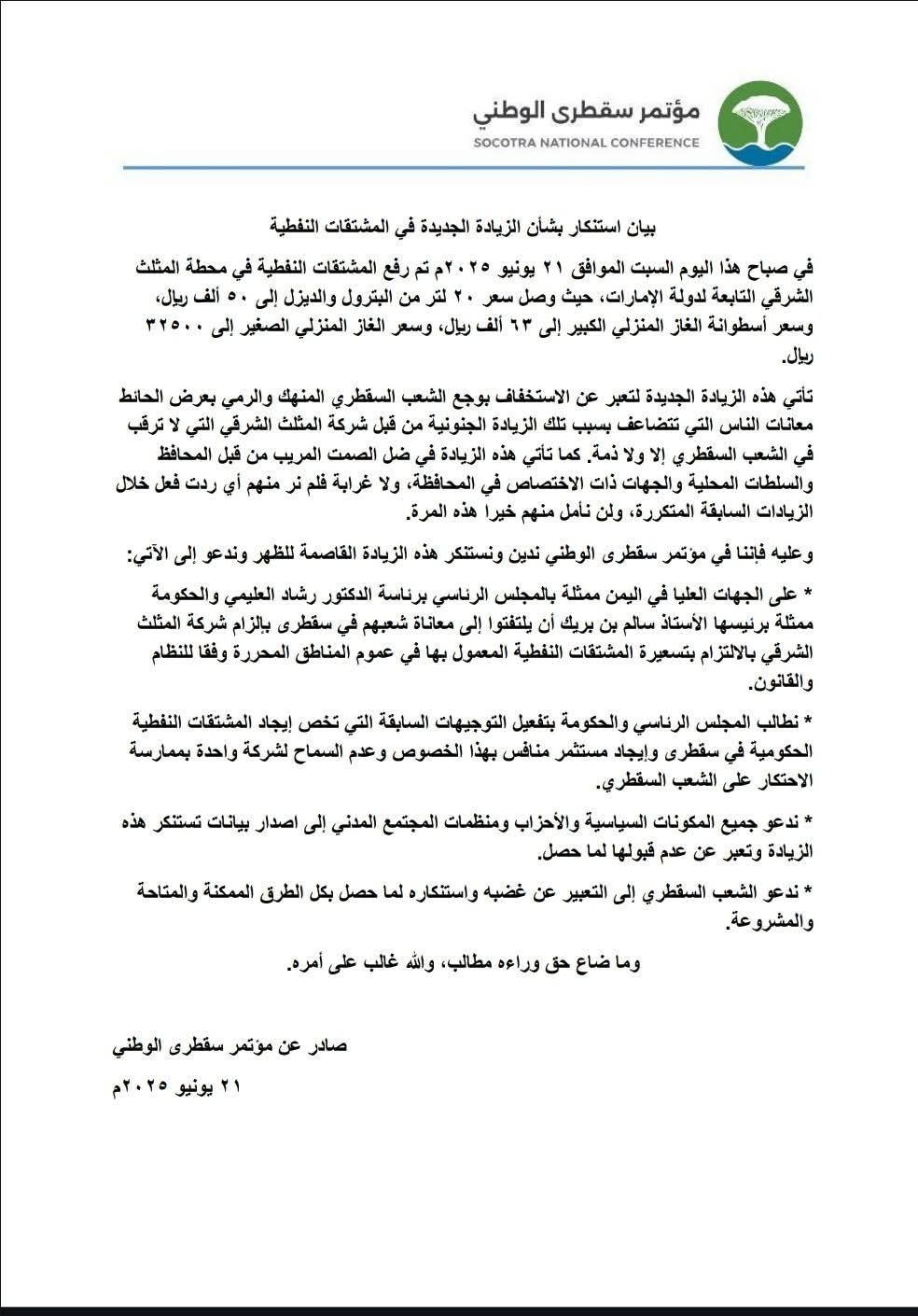 وأدان مؤتمر سقطرى الوطني هذه الزيادة الجنونية والتي وصفها بأنها "قاصمة للظهر"، داعيا المجلس الرئاسي والحكومة للإلتفات إلى معاناة أبناء سقطرى بالزام شركة المثلث الشرقي بالالتزام بتسعيرة المشتقات النفطية المعمول بها في عموم المناطق المحررة وفقا للنظام والقانون.