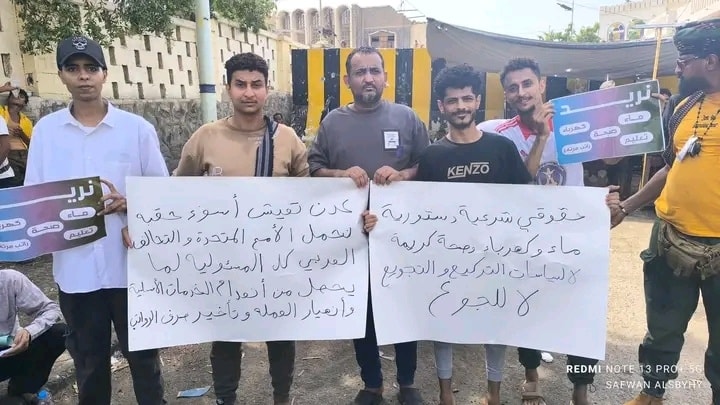 ورفع المحتجون، الذين تجمعوا أمام قصر معاشيق، شعارات تطالب بتوفير خدمات الكهرباء والمياه والغاز المنزلي وبقية الخدمات العامة، بالإضافة لمعالجة انهيار العملة الوطنية.