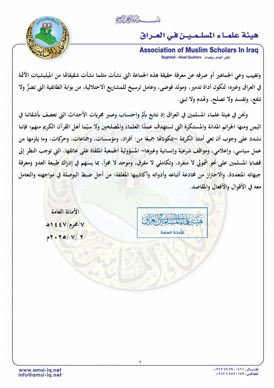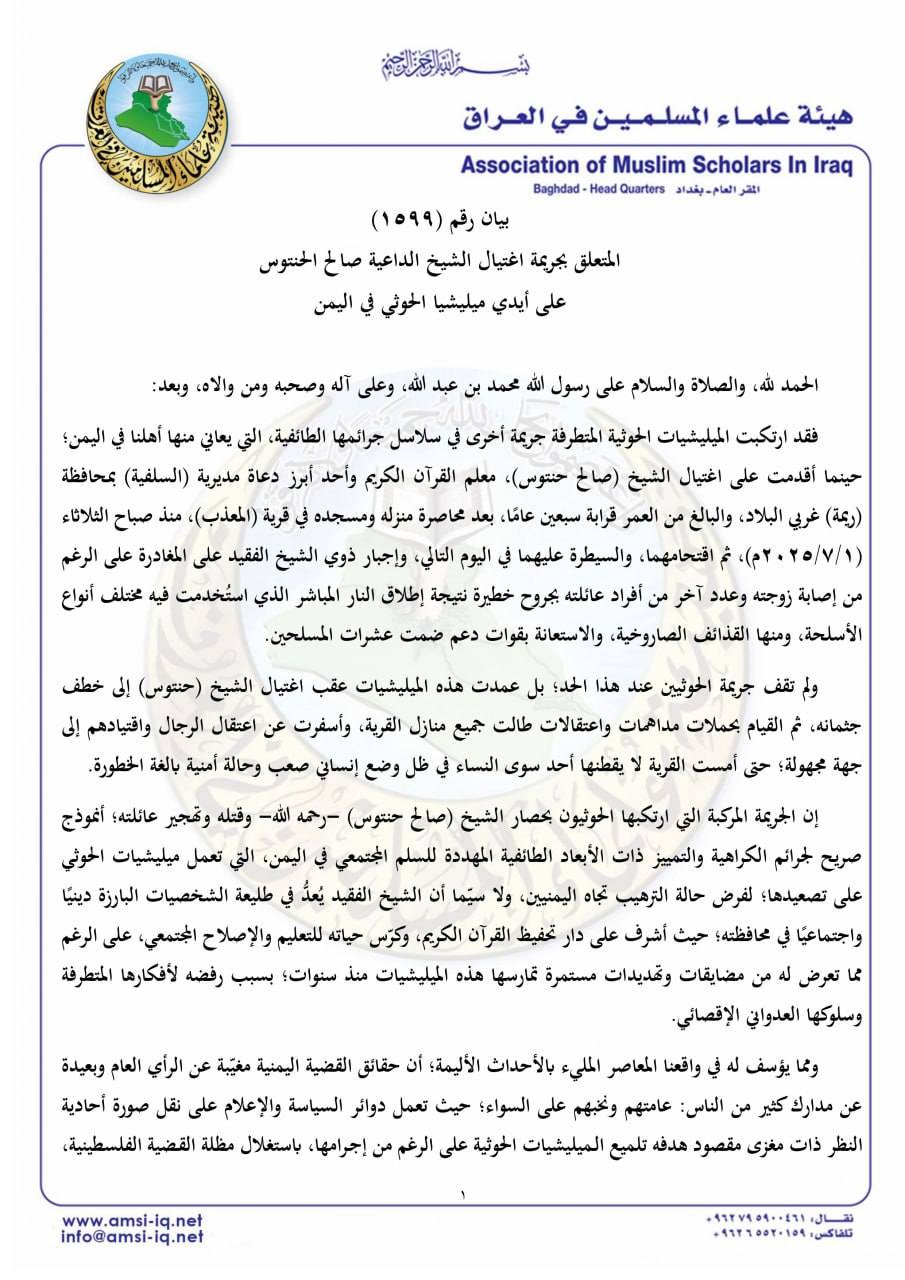 وذكرت هيئة علماء المسلمين في العراق أنها تتابع "بألم واحتساب وصبر مجريات الأحداث التي تعصف بأشقائنا في اليمن ومنها الجرائم المدانة والمستنكرة التي تستهدف عمدًا العلماء والمصلحين ولا سيما أهل القرآن الكريم منهم".