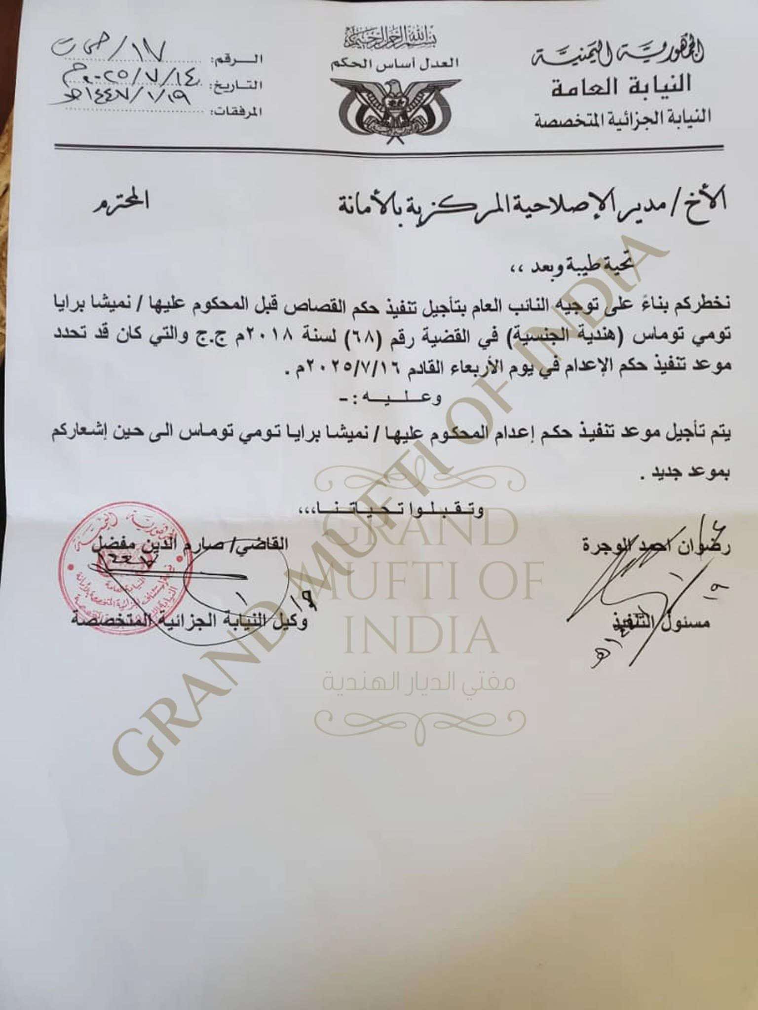 وفي مذكرة لوكيل النيابة الجزائية المتخصصة، فقد طالبت مدير الإصلاحية المركزية في أمانة العاصمة بتأجيل تنفيذ حكم الإعدام المقرر بحق الممرضة الهندية حتى إشعار آخر، بناء على توجيهات النائب العام.