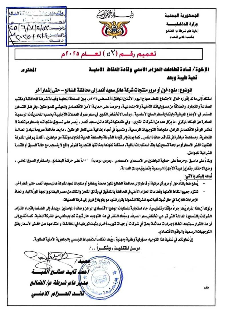 وشدد التعميم، على منع دخول أو مرور أي مركبة أو قاطرة إلى محافظة الضالع تكون محملة ببضائع أو منتجات تعود لشركة هائل سعيد أنهم، حتى إشعار آخر.