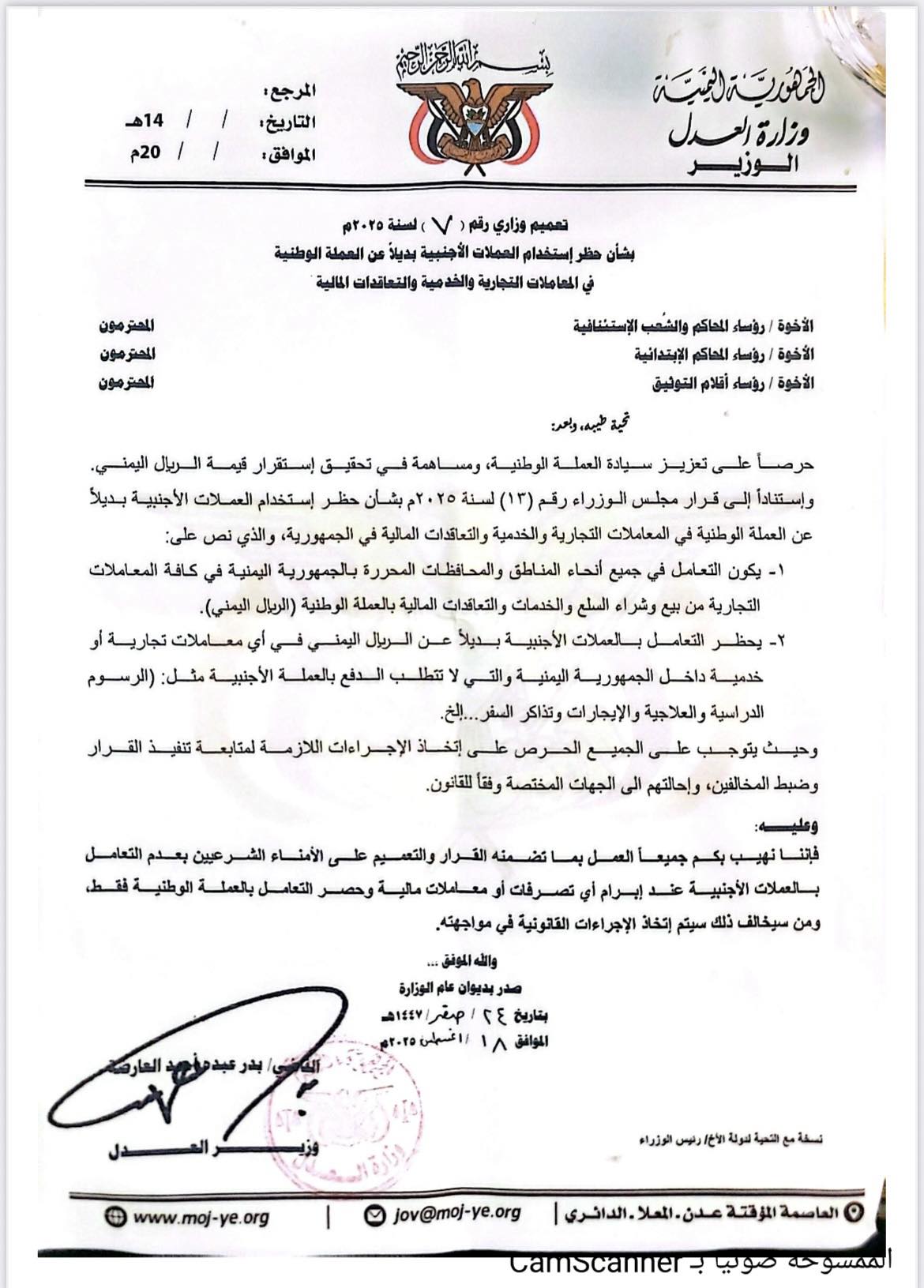 وشدد وزير العدل على ضرورة متابعة تنفيذ القرار، وضبط المخالفين وإحالتهم إلى الجهات المختصة وفقاً للقانون، لافتاً إلى أن الأمناء الشرعيين ملزمون بعدم إبرام أي تصرفات أو عقود مالية بغير العملة الوطنية، وأن أي مخالفة ستُواجه بإجراءات قانونية صارمة.