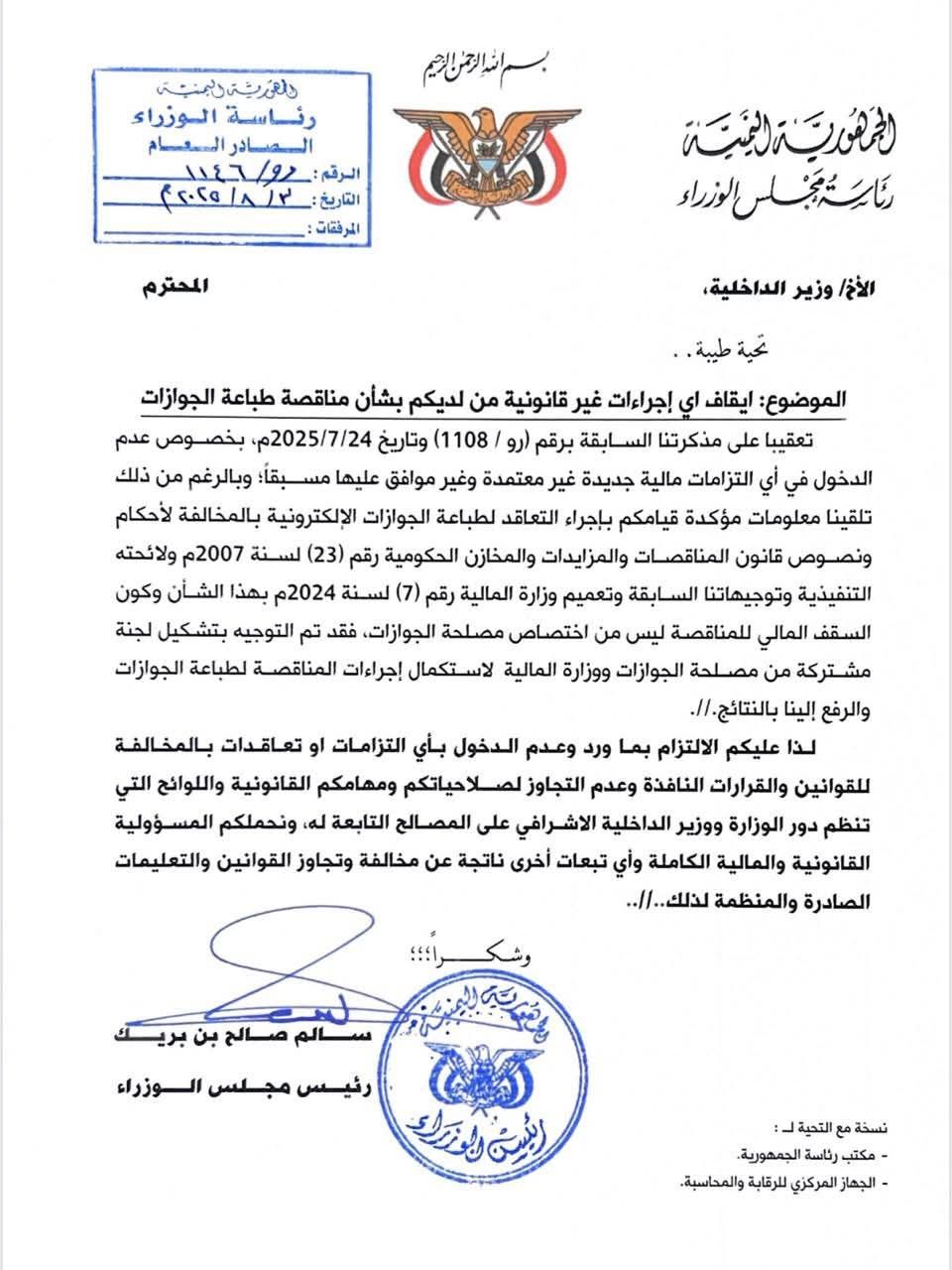 وطالبت المذكرة، وزير الداخلية بعدم الدخول في أي التزامات مالية جديدة غير معتمدة وغير موافق عليها مسبقاً؛ مشيرا لتلقي رئيس الوزراء معلومات مؤكدة عن قيام وزارة الداخلية بإجراء التعاقد لطباعة الجوازات الإلكترونية بالمخالفة لأحكام ونصوص قانون المناقصات والمزايدات والمخازن الحكومية رقم (23) لسنة 2007م ولائحته التنفيذية وتوجيهات رئيس الوزراء السابقة وتعميم وزارة المالية رقم (7) لسنة 2024م بهذا الشأن.