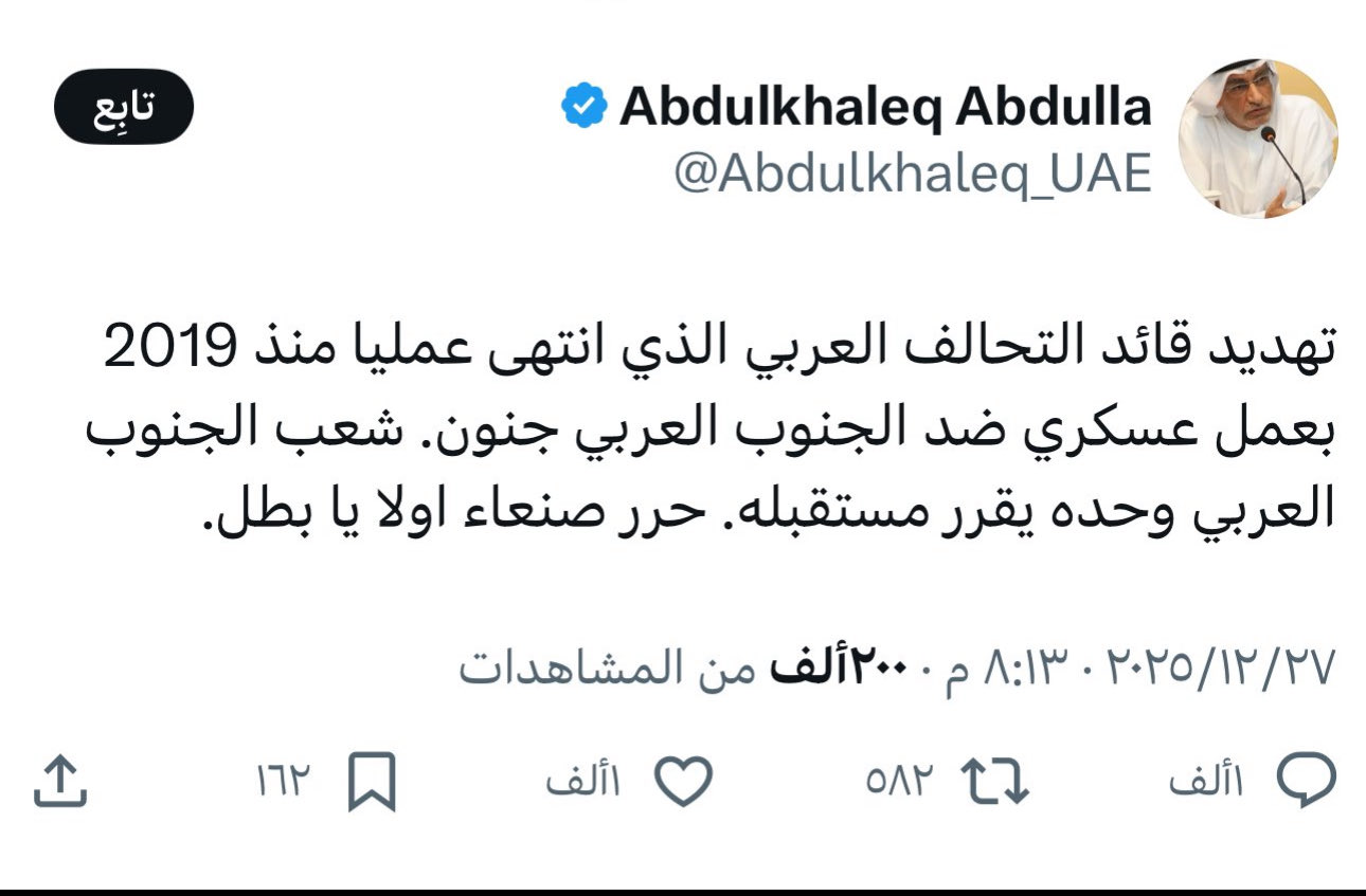 اضطر عبدالله عبدالخالق مستشار حاكم الإمارات محمد بن زايد لحذف تغريدة من حسابه في منصة إكس، بعد إثارته للجدل، بعد تضمنها إتهامات للسعودية بالفشل في اليمن.