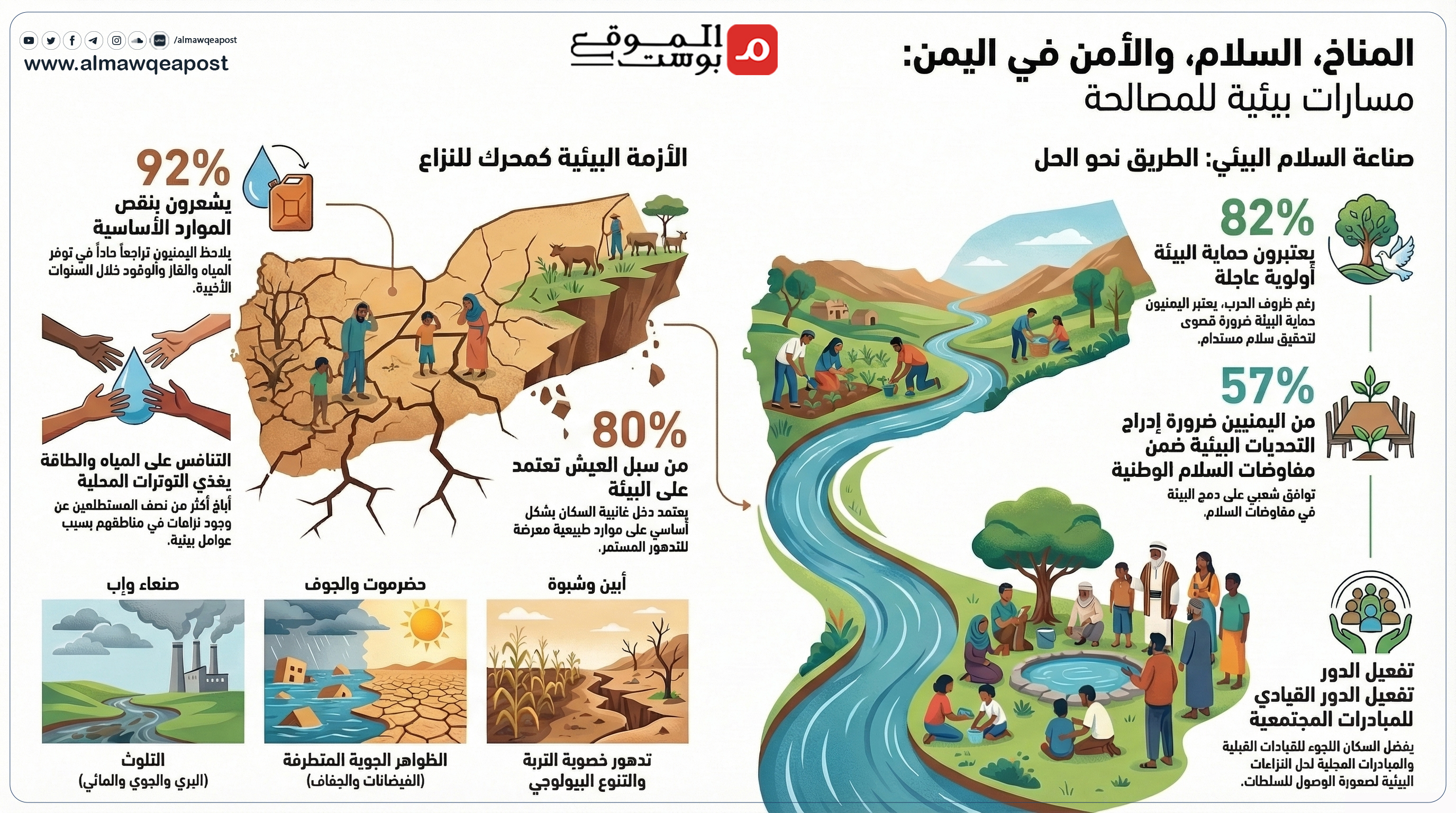 واعتبر صنع السلام البيئي كحل مستقبلي ينادي بضرورة تبني نهج "صنع السلام البيئي"، مشيراً إلى أن 57% من اليمنيين يعتقدون بوجوب دمج التحديات البيئية ضمن مفاوضات السلام الوطنية.