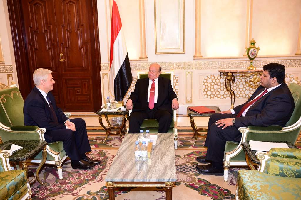 وقالت وكالة "سبأ" الرسمية إن الرئيس هادي استقبل اليوم السفير الروسي لدى اليمن فلاديمير ديدوشكن، والسفير الأمريكي لدى اليمن ماثيو تولر، لمناقشة جملة من القضايا المتصلة بالعلاقات الثنائية بين البلدين، إضافة إلى مستجدات الأوضاع ومنها ما يتصل بإرساء معالم السلام بصورة عامة.