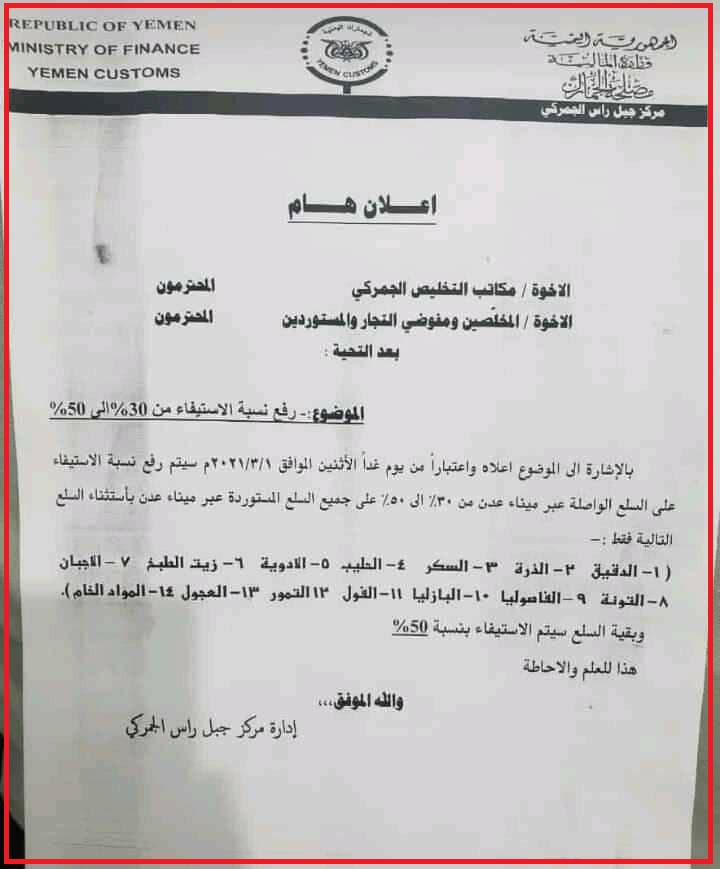 جماعة الحوثي تفرض زيادة جمركية على البضائع القادمة من ميناء عدن