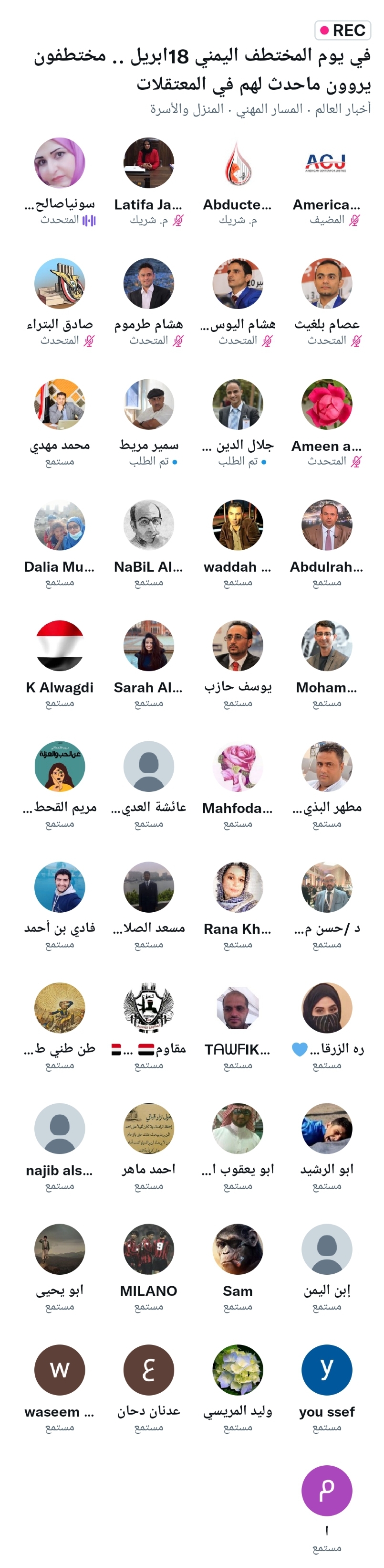 جاء ذلك خلال جلسة عقدها، كل من رابطة أمهات المختطفين والمركز الأمريكي للعدالة (ACJ) على منصة تويتر، للاستماع إلى شهادات عدد من المختطفين المفرج عنهم حول تجاربهم في الاختطاف، ضمن حملة يوم المختطف التي قاما بتنفيذها لإطلاق المختطفين اليمنيين في سجون الميليشيات الحوثية والأجهزة الحكومية المختلفة، مع السعي لاعتماد يوم 18 من أبريل ليكون مناسبة سنوية رسمية وشعبية للتضامن مع المختطفين لإنهاء معاناتهم ورد الاعتبار لهم.