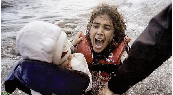 امرأة سورية ترمي بابنها بعيدا عن الشاطئ لدى وصولها اليونان أمس.