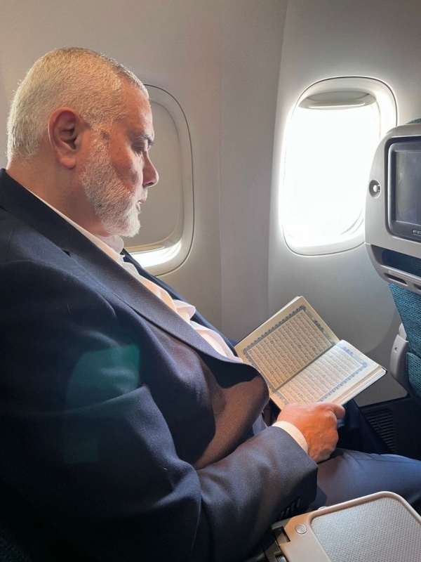 وأظهرت صورة نشرتها حركة حماس الشهيد إسماعيل هنية وهو يجلس في الطائرة ويمسك المصحف.
