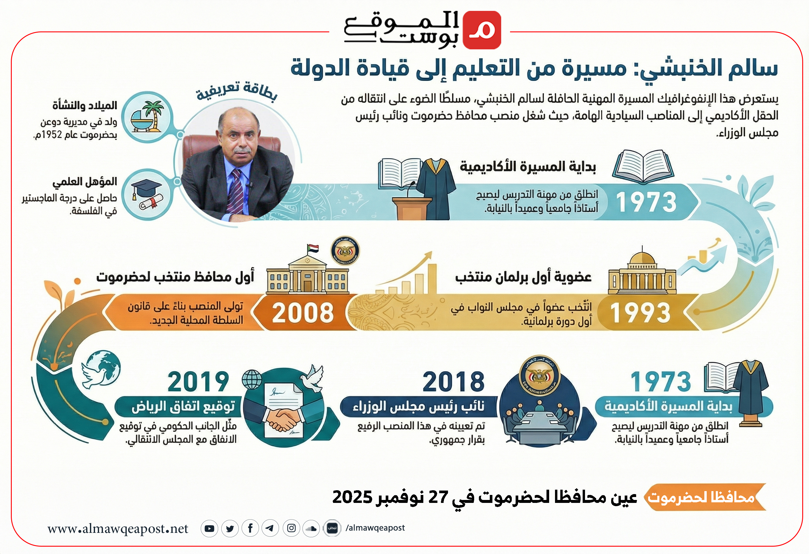 المحافظ الجديد لحضرموت سالم الخنبشي، يعود من جديد بعد 13 عاما من مغادرة ذات المنصب الذي سبق وأن تولاه في محافظة حضرموت عقب أول عملية انتخابية لمحافظي المحافظات مايو 2008، من قبل أعضاء المجالس المحلية بالمحافظات، ليتولى قيادة المحافظة حتى 2012م.