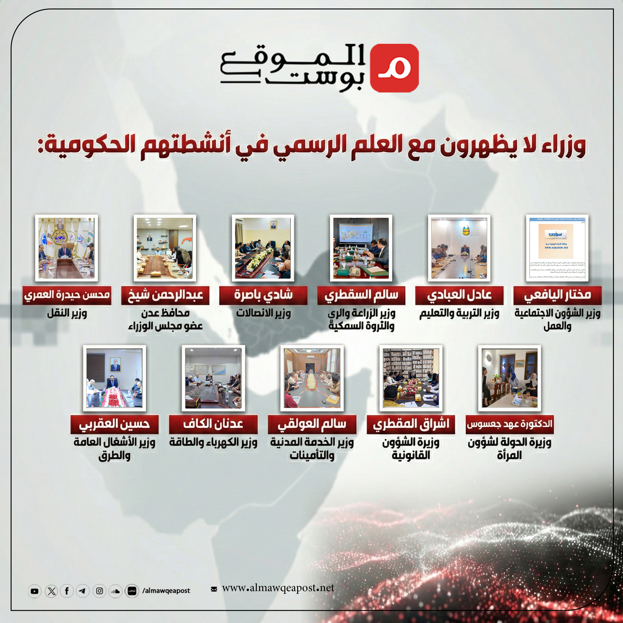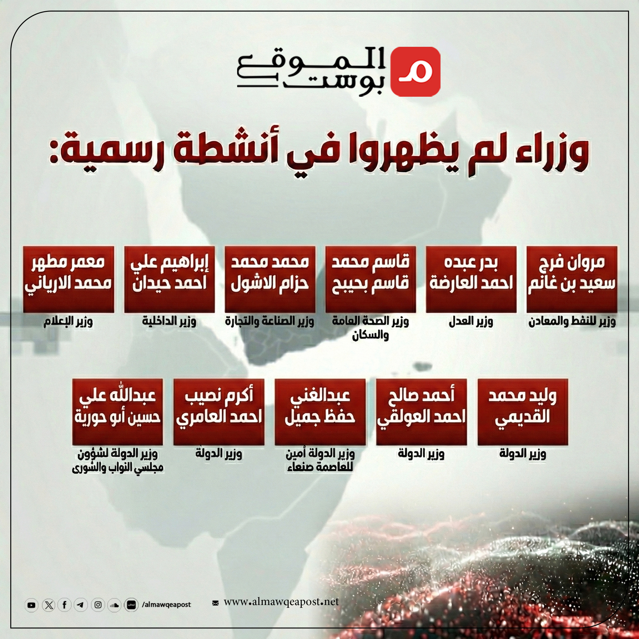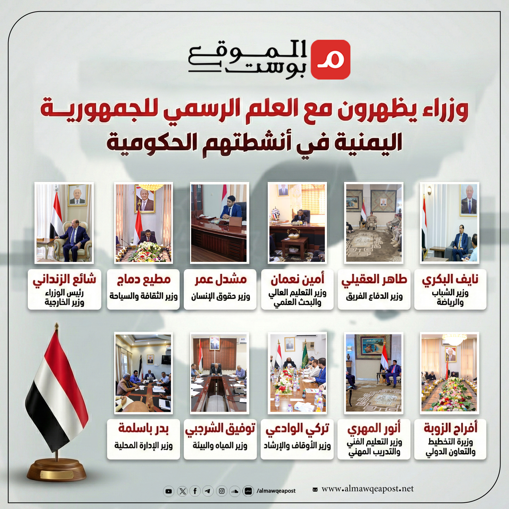 وهنا ننشر قائمة بأسماء الوزراء الذين ظهورا برفقة علم الجمهورية اليمنية خلال أنشطتهم، وأولئك الذين تجنبوا الظهور، وكذلك البقية من الوزراء الذين لم يظهروا حتى إعداد هذه المادة في أي أنشطة عامة.