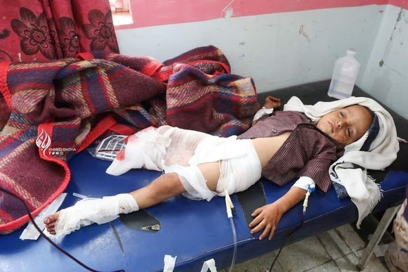 [ احد الاطفال المصابين لقذيفة أطلقتها جماعة الحوثي في تعز ]