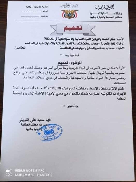هدد مكتب التجارة والصناعة في محافظة  شبوة (شرق اليمن) الإثنين، باتخاذ إجراءات صارمة بحق التجار الرافضين تخفيض أسعار السلع، بعد تحسن كبير للعملة المحلية التي تراجعت إلى 850 ريالا للدولار الواحد.