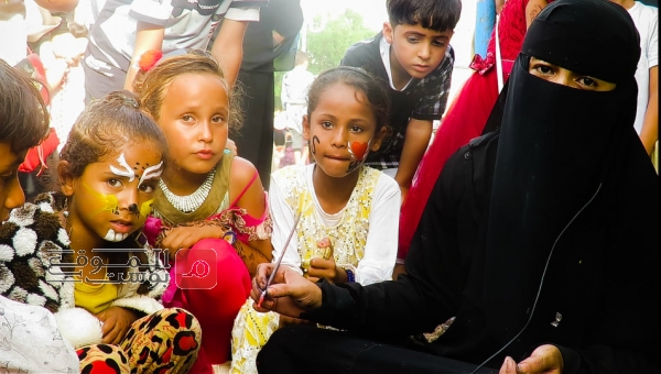 رسوم باتمان وفراشات وقلوب ملونة بألوان العلم الوطني نرسمها بريشة ومساحيق وحبر جاف سريع الإزالة على وجوه الأطفال هنا في حديقة مأرب.