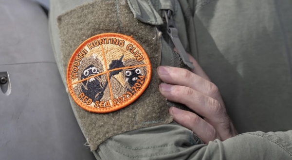 [ شارات على كتف أحد ضباط البحرية الأمريكية كتب عليها "نادي صيد الحوثيين" ]